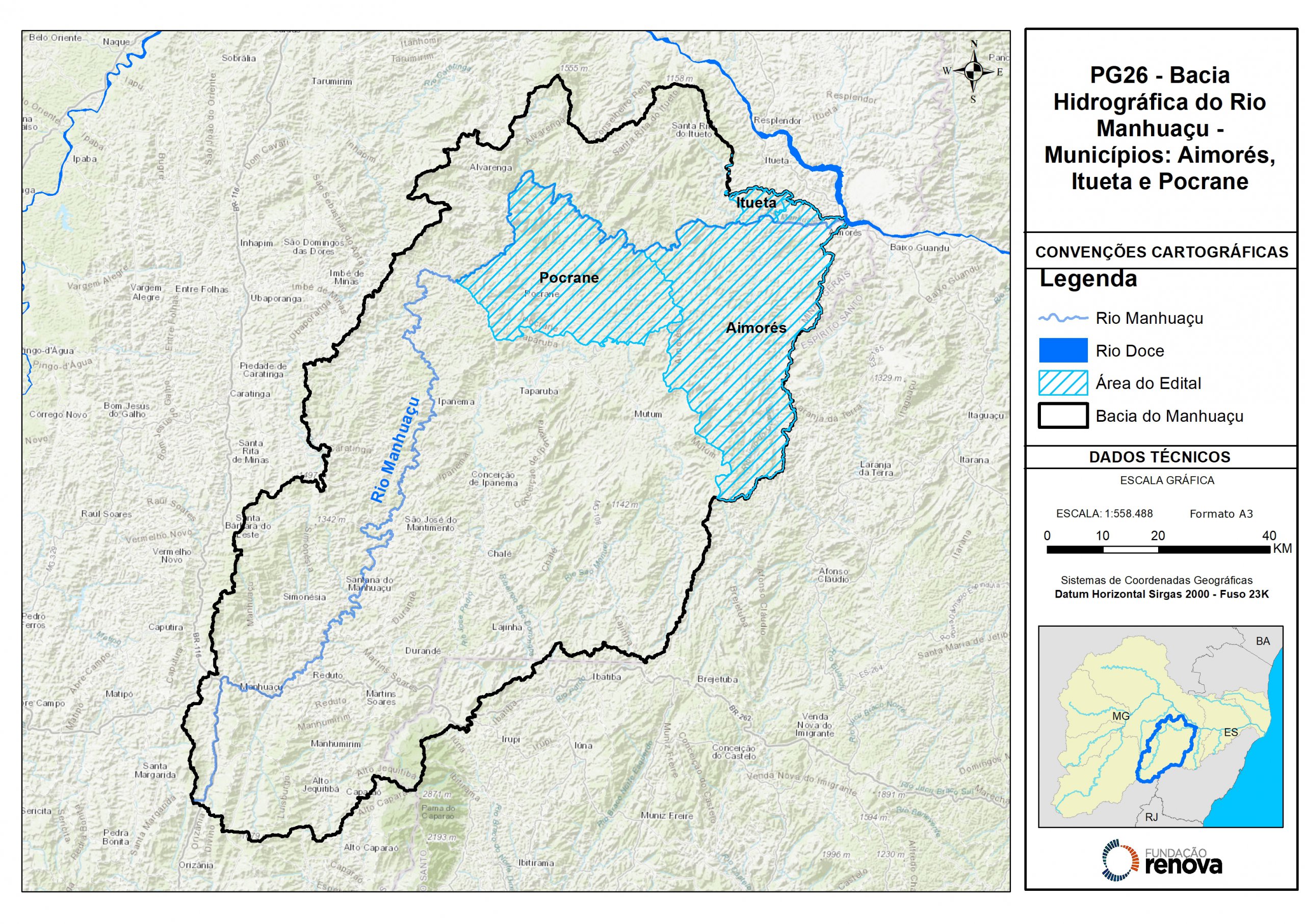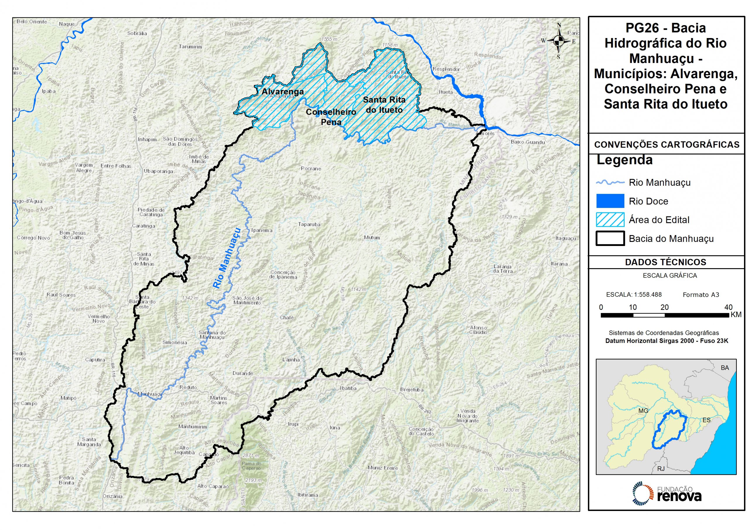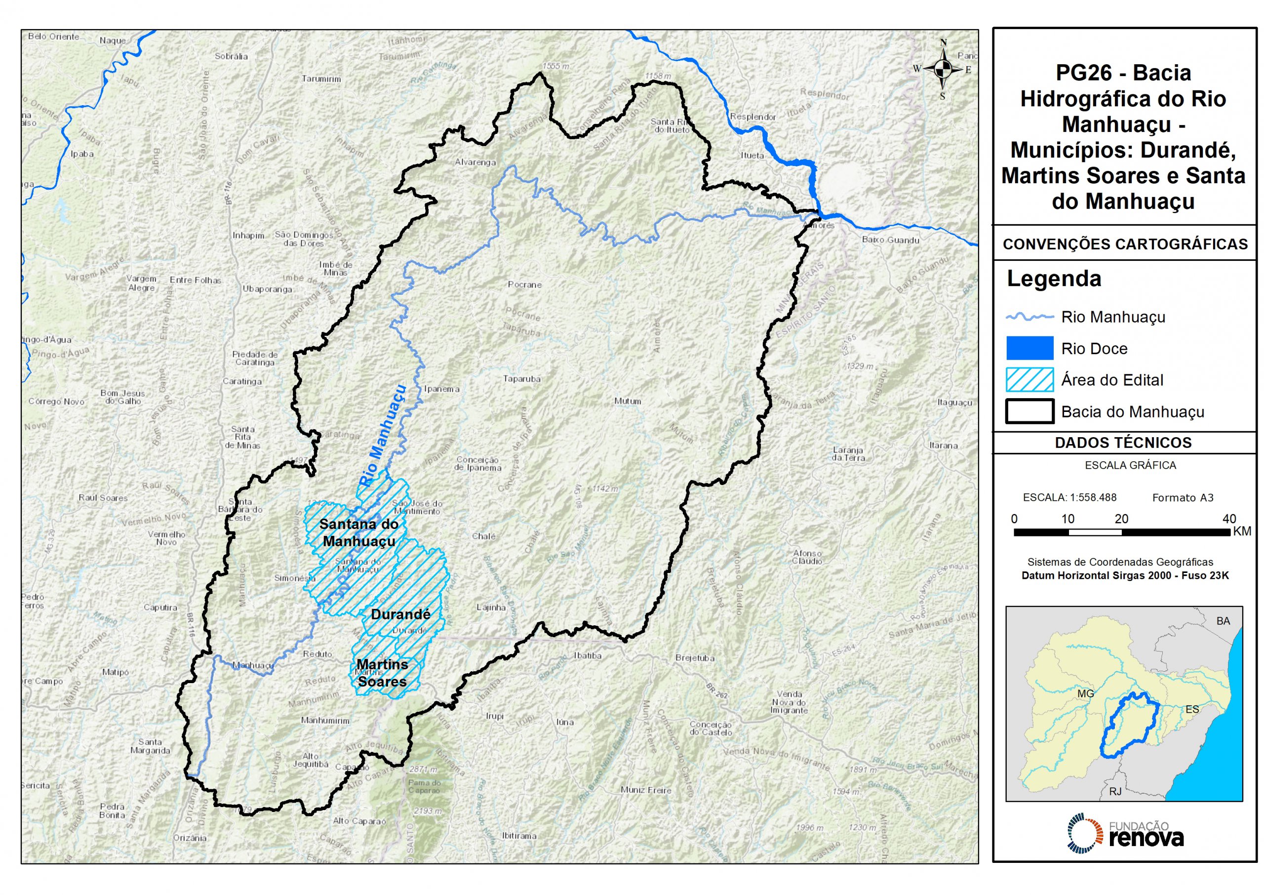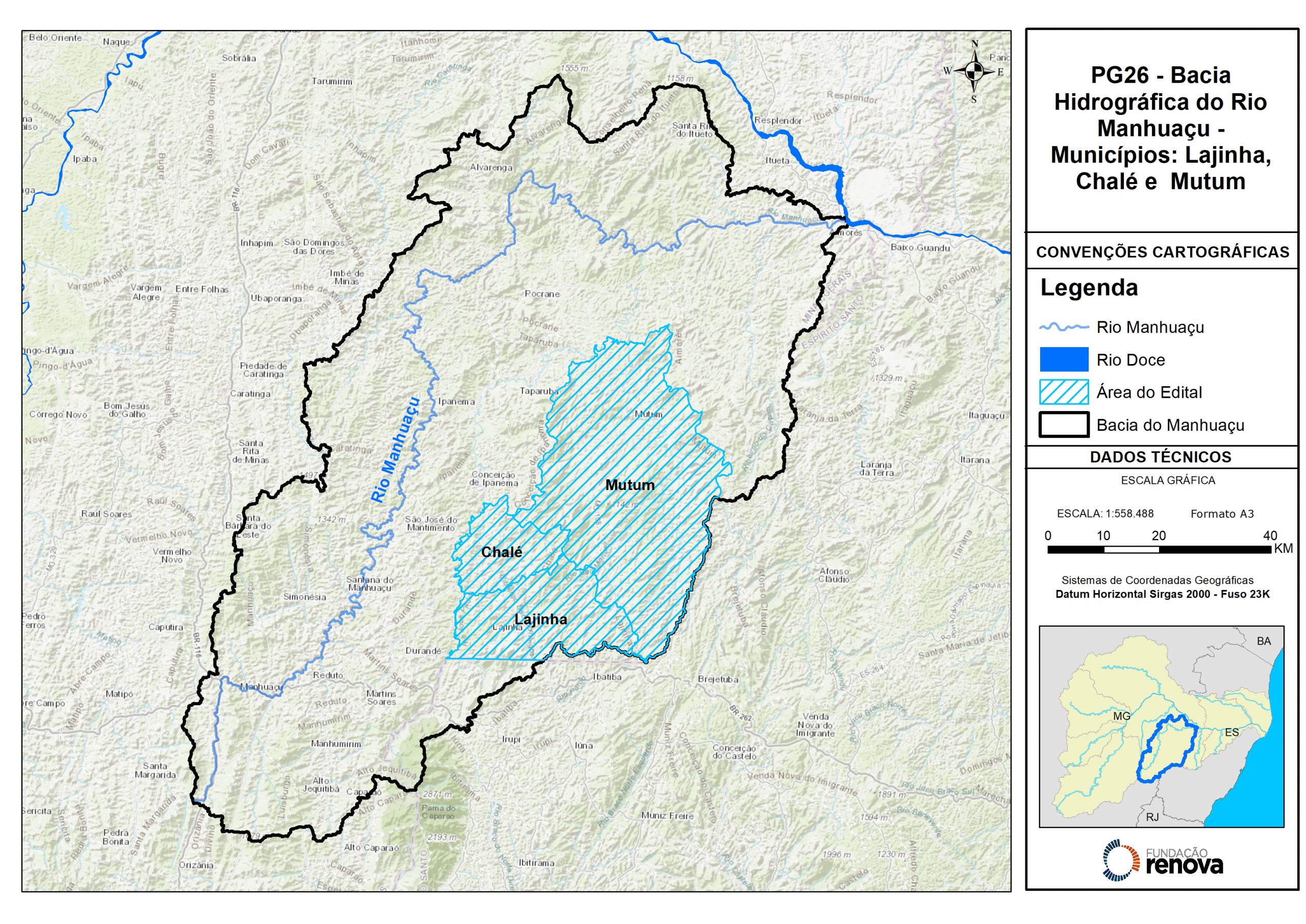 Este edital tem como finalidade a contratação empresas e/ou consórcios para prestação de serviços técnicos, científicos e operacionais referente à restauração florestal de um total de 2.881,32 hectares na bacia do rio Manhuaçu. Dividida em quatro lotes, a iniciativa vai contemplar 12 municípios de Minas Gerais, sendo três por lote. O recurso financeiro definido para cada lote é de R$ 26.040.273,60. O edital vai atender parte do Programa de Recuperação das Áreas de Preservação Permanente (APP) e de Recarga Hídrica (ARH) degradadas da Bacia do Rio Doce, da extinta Fundação Renova.